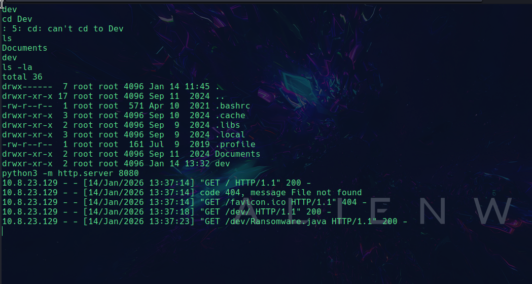 Now we go to the /root folder and check the Dev and Document folder. For view the data of /root folder we use python server.In server terminal