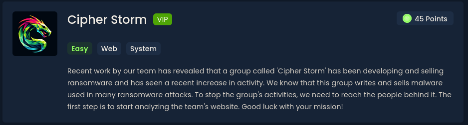 Recent work by our team has revealed that a group called 'Cipher Storm' has been developing and selling ransomware and has seen a recent increase in activity. We know that this group writes and sells malware used in many ransomware attacks. To stop the group's activities, we need to reach the people behind it. The first step is to start analyzing the team's website. Good luck with your mission!