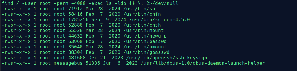 Here we can see screen 4.5.0 is set with SUID. After some research, we found an escalation method: GNU Screen 4.5.0 - Local Privilege Escalation